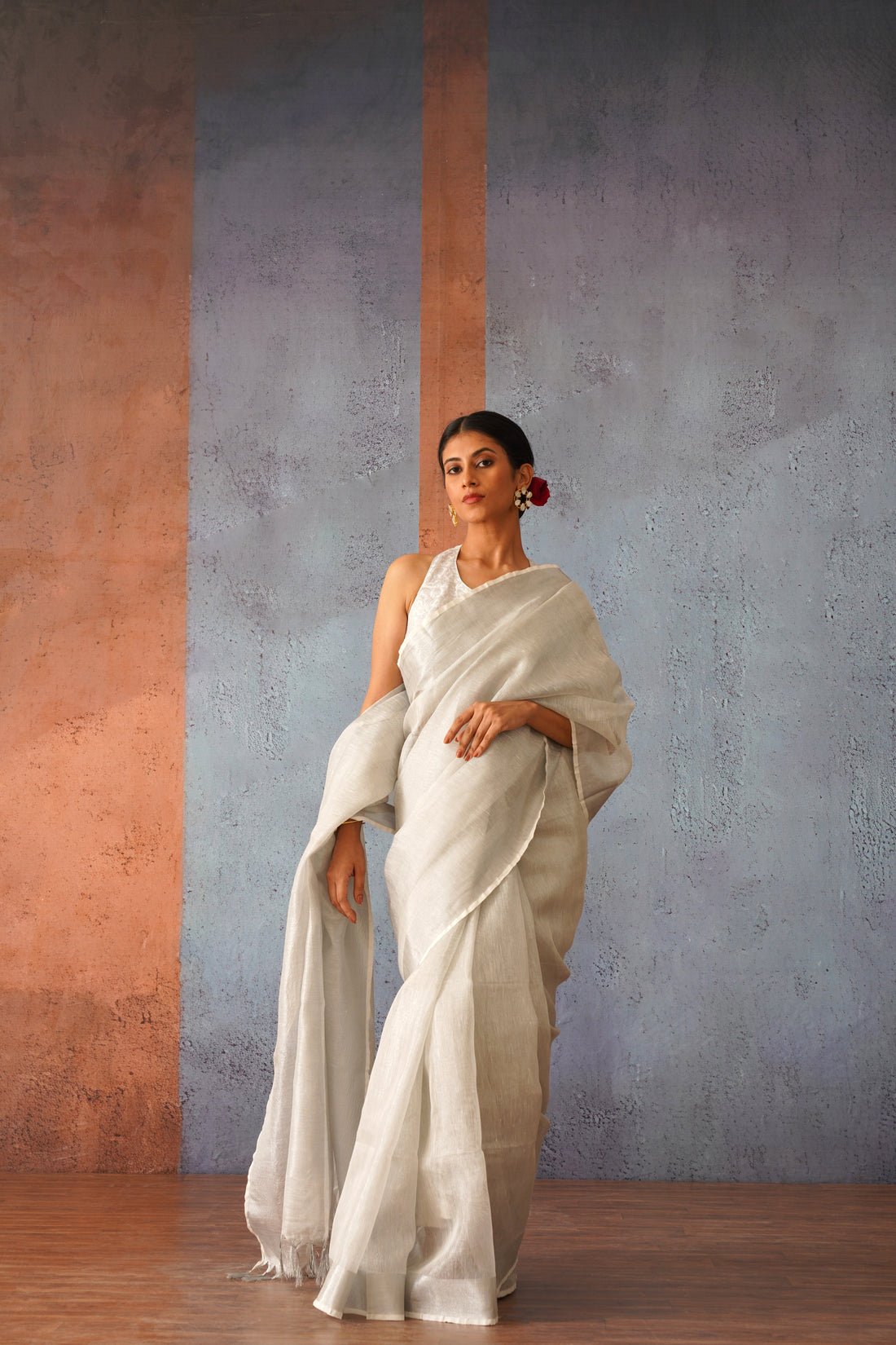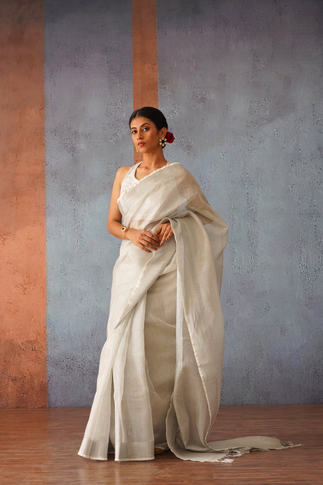 + Free ShippingLook radiant in this striking Moon Goddess Silver Linen Zari Sari. Featuring a luxurious silver linen and intricate zari detailing, this timeless piece offers stunning sheen and sparkle that will set you apart. Perfect for any special occasion, flaunt your style and shine like the goddess you are.