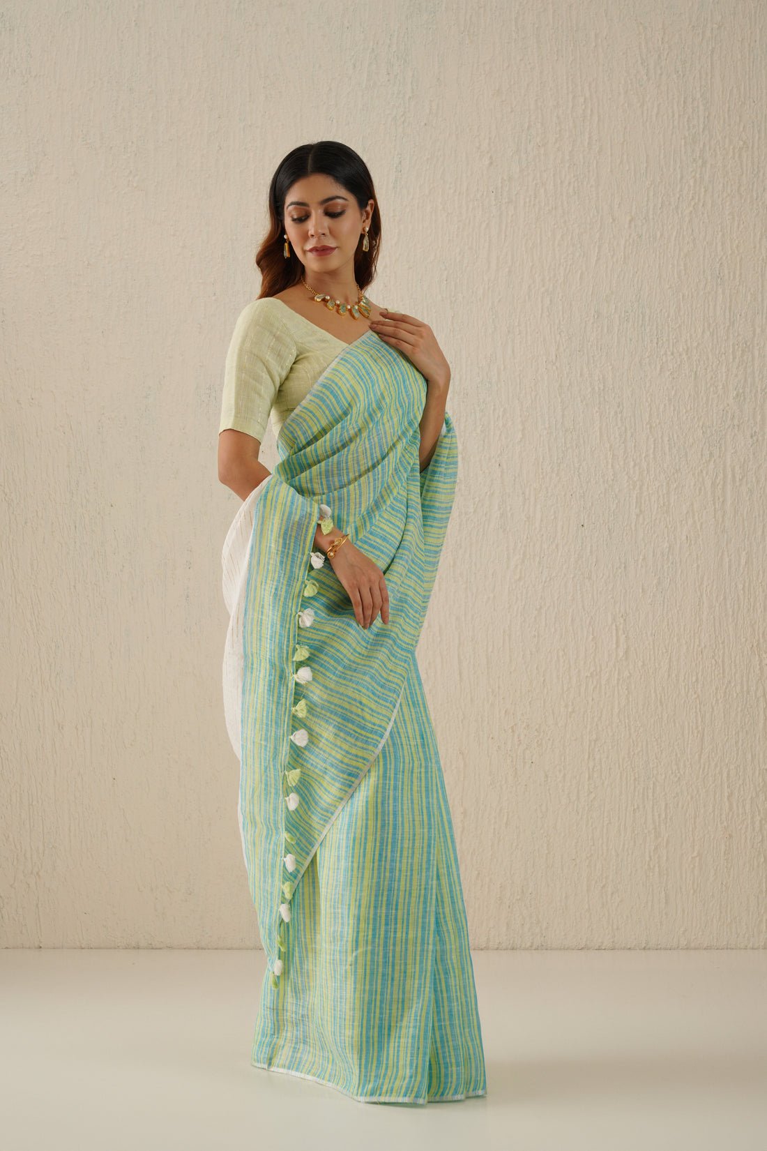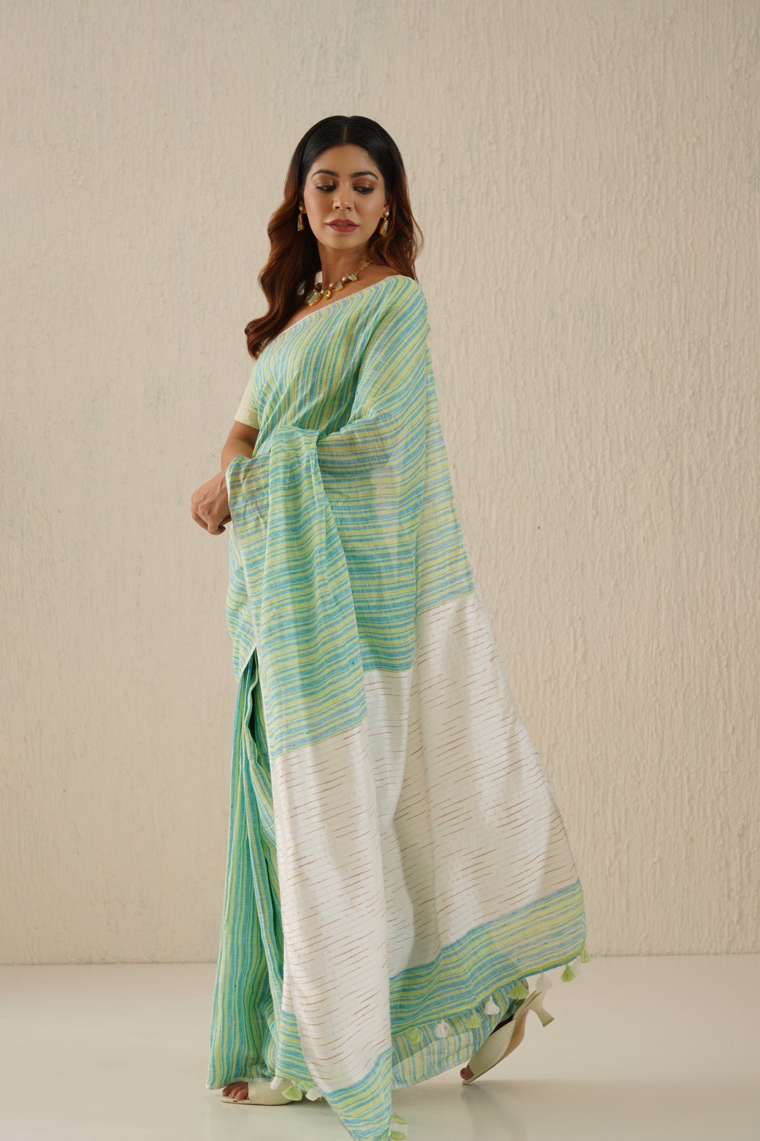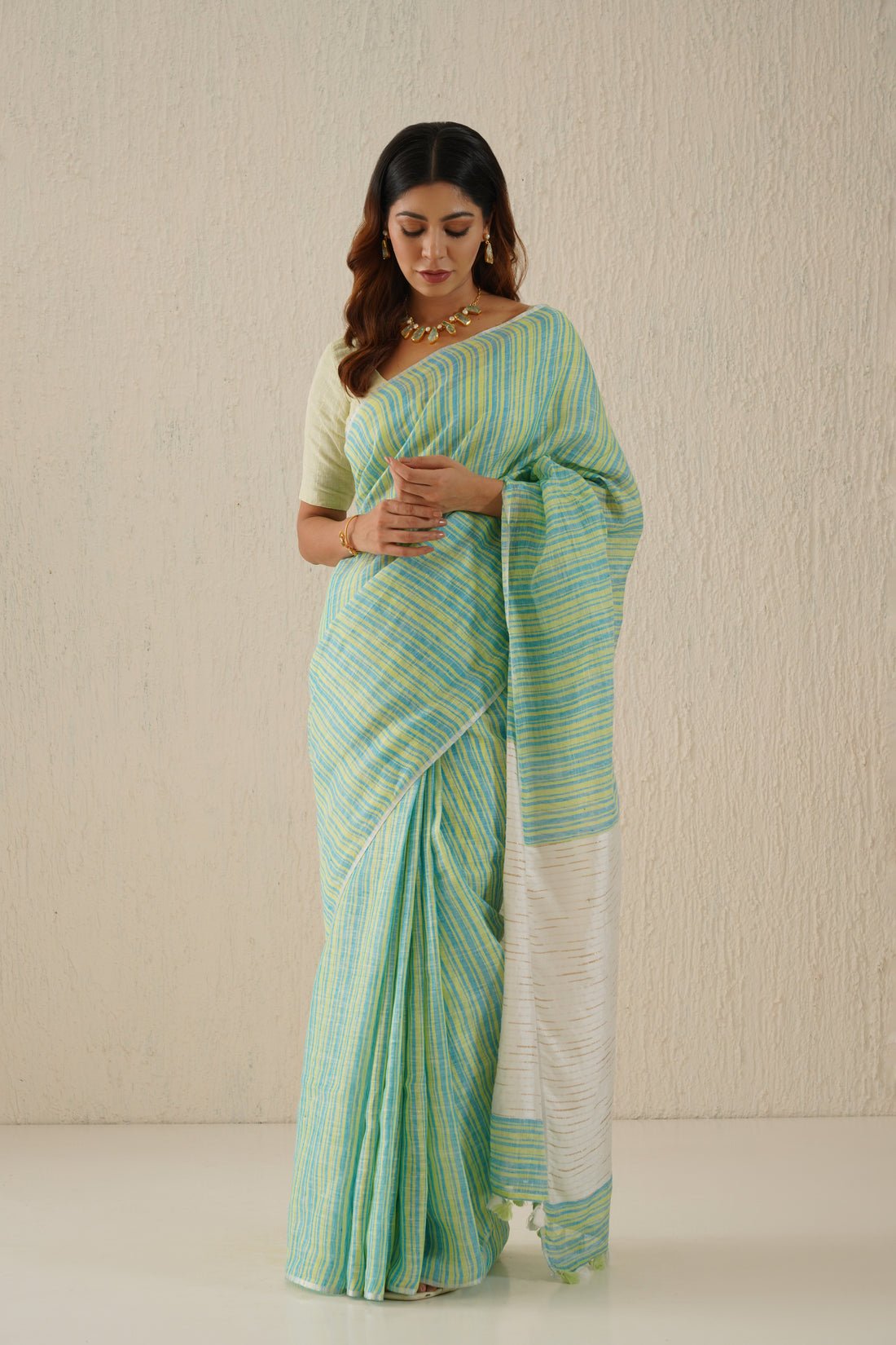 Myra Aqua Striped Handloom Linen Sari