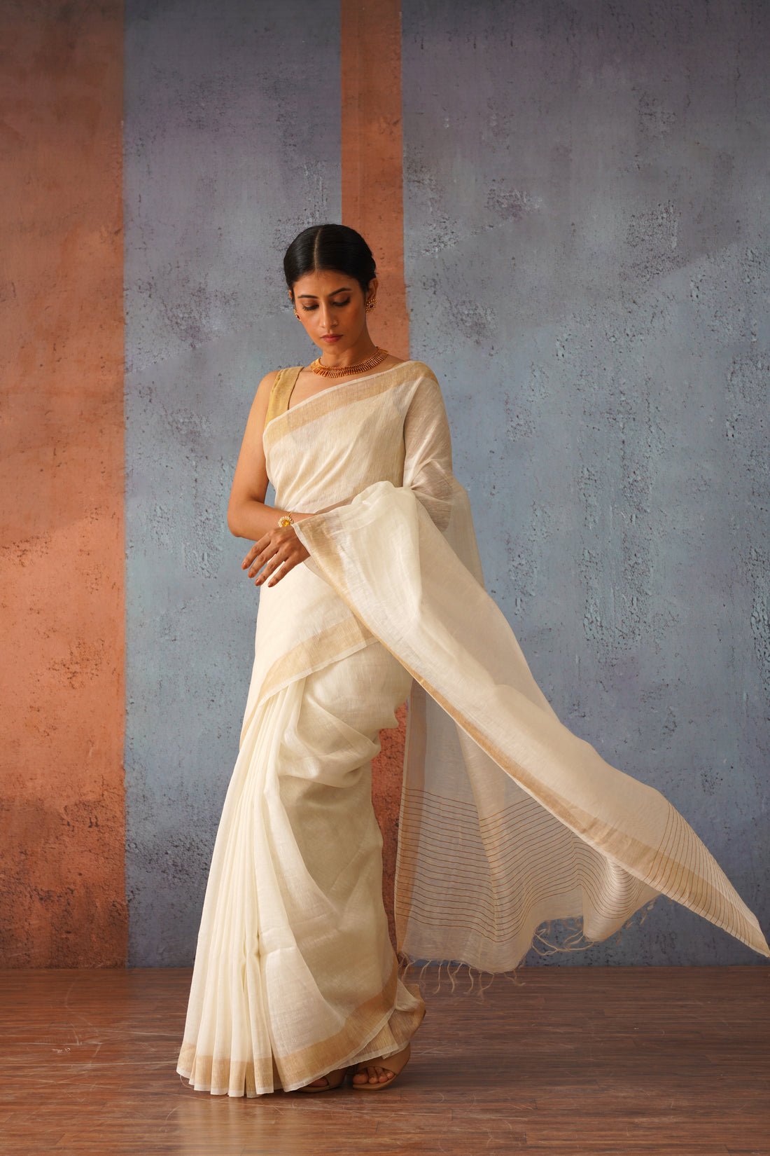 + Free ShippingA gorgeous ensemble for a special occasion, this Off White Linen Silk Sari with a Gold Zari pallu is sure to make a sophisticated statement. Created with superior quality craftsmanship, the intricate design of this sari exudes luxury and exclusivity with its elegant colors and delicate gold threading. Crafted with the utmost attention to detail, this sari will bring an air of refinement and grace to your wardrobe.